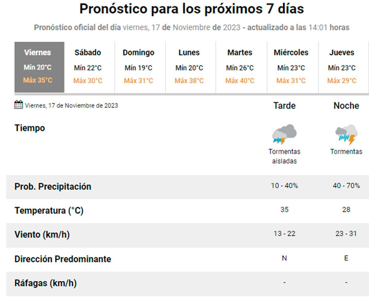 Asimismo, según el SMN, para la ciudad Capital también están pronosticadas lluvias durante esta tarde y noche, llegando a una probabilidad de precipitación de hasta 70%.