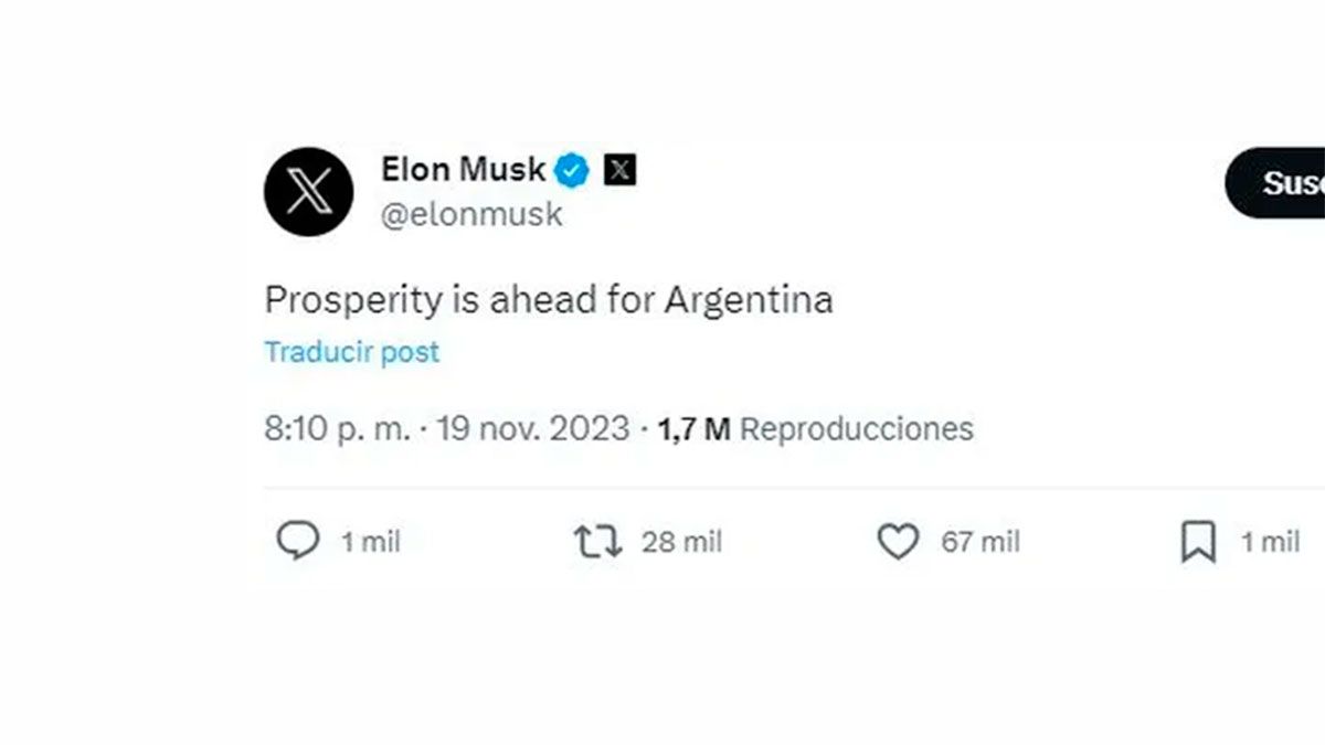 A través de un posteo en la red social X (ex Twitter), Elon Musk celebró el triunfo de Javier Milei en la segunda vuelta electoral en la Argentina.