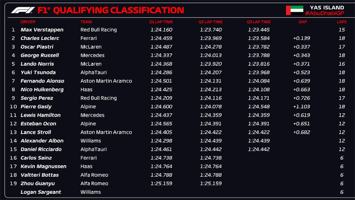 El piloto monegasco Charles Leclerc (Ferrari) finalizó segundo en la clasificación, con un tiempo de 1m. 23s. 584/1000, y el australiano Oscar Piastri (McLaren) fue tercero y este domingo largará desde la segunda fila de la grilla.