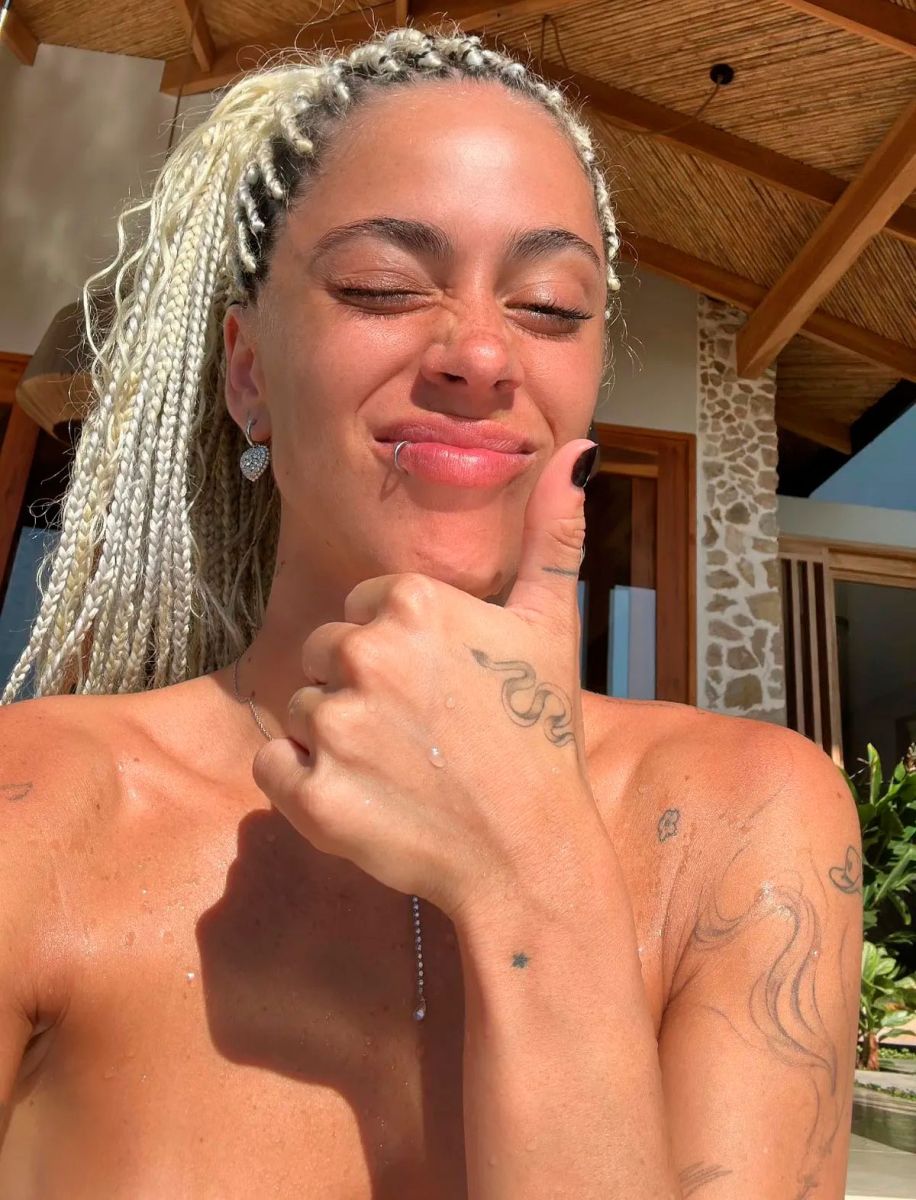 En sus historias de Instagram, Tini subió una foto en topless, desde la pileta, con sus trencitas largas y rubias sonriendo a la cámara y levantando el pulgar.