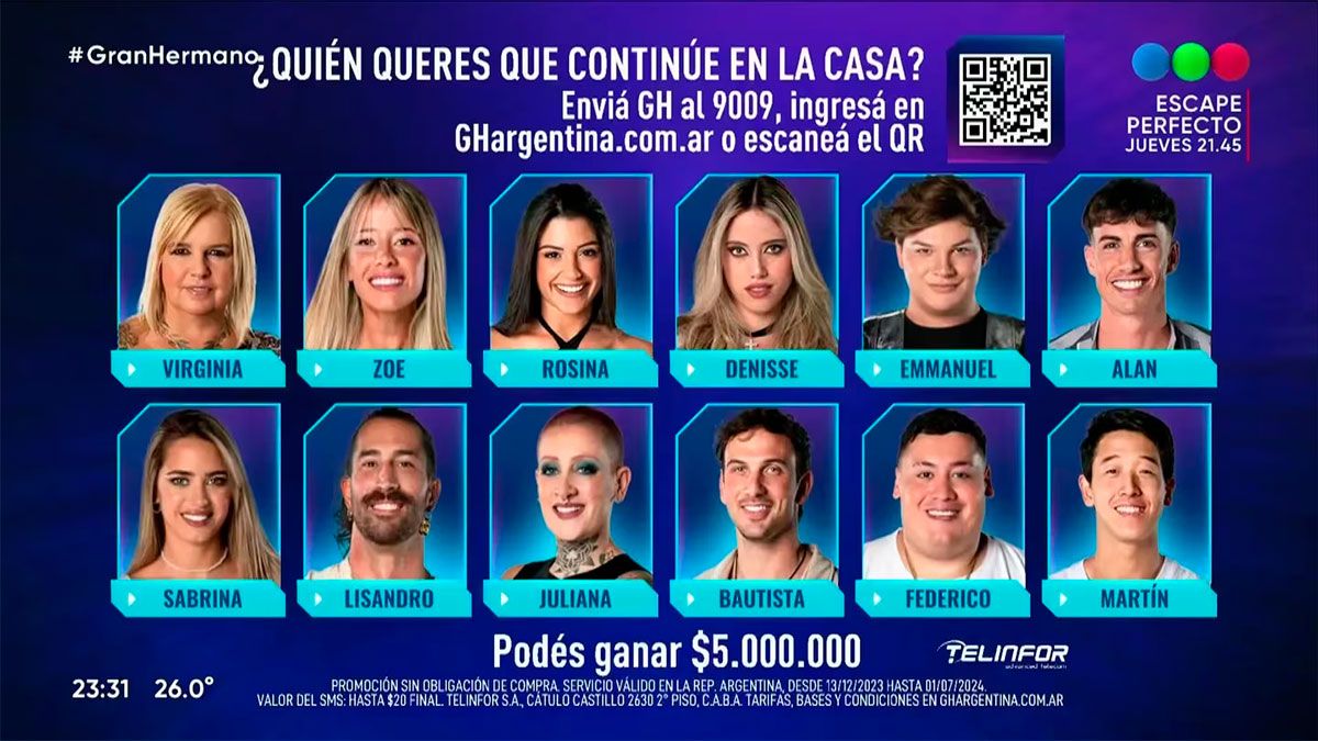 “Los que zafaron son Nicolás, Lucía y Joel”, contó el conductor del reality de Telefe, dando como resultado que Virginia, Zoe, Rosina, Denisse, Emmanuel, Alan, Sabrina, Licha, Furia, Bautista, Manzana y Martín Ku deban dirimir su permanencia según la decisión del público.
