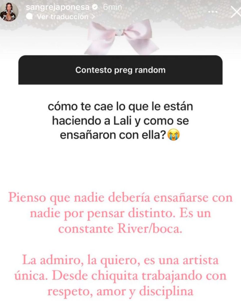 A través de sus stories de Instagram, la modelo aprovechó un momento de diálogo con sus seguidores para dar su opinión sobre lo ocurrido este sábado en Córdoba. “¿Cómo te cae lo que le están haciendo a Lali y como se ensañaron con ella?”, le dijo una fan a la mediática junto al emoji de una cara llorando. Con ese puntapié, la influencer respondió: “Pienso que nadie debería ensañarse con nadie por pensar distinto. Es un constante River - Boca”.