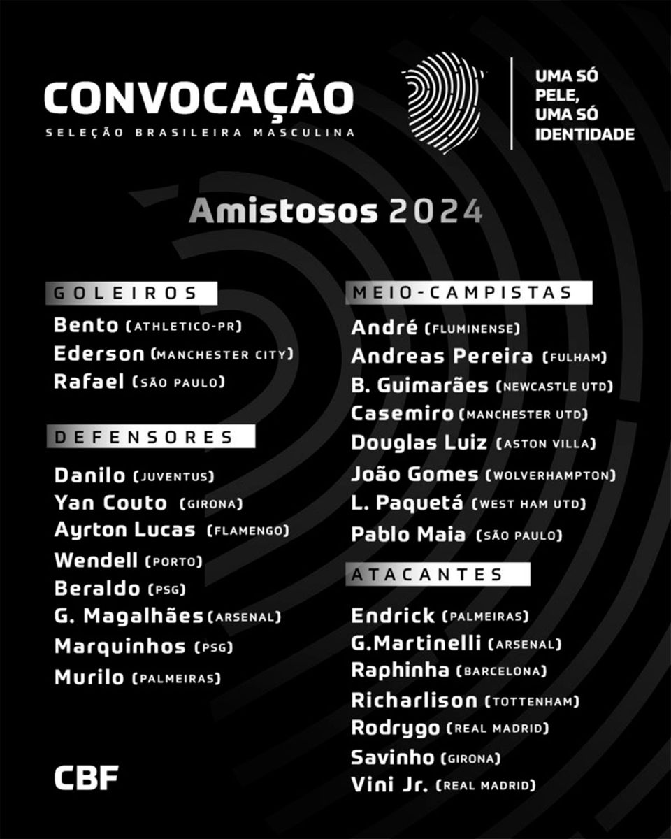 Los nombres más destacados que aparecieron son los de Vinicius Junior (Real Madrid), Endrick (Palmeiras), Richarlison (Tottenham), Casemiro (Manchester United), Marquinhos (PSG) y Ederson (Manchester City).