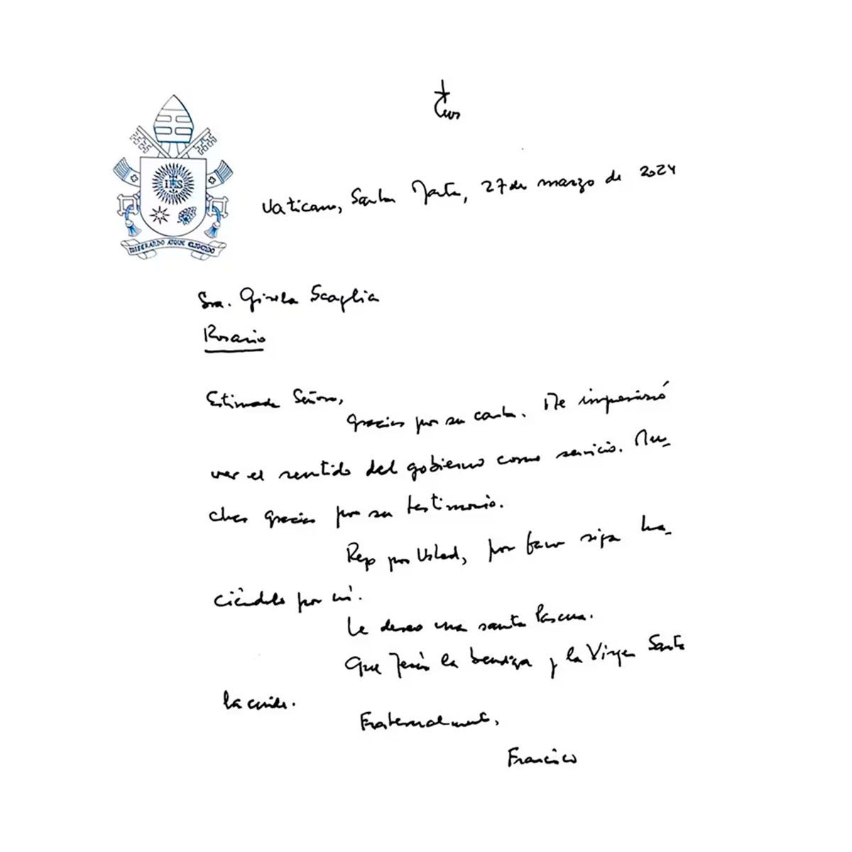 El mismo miércoles a la noche, la vicegobernadora recibió una respuesta escrita de puño y letra por el Papa, que comienza agradeciendo y agrega: “Me impresionó en el sentido del gobierno como servicio”. “Rezo por usted, le pido que lo siga haciendo por mí”, dice en otro tramo la carta del sumo pontífice.