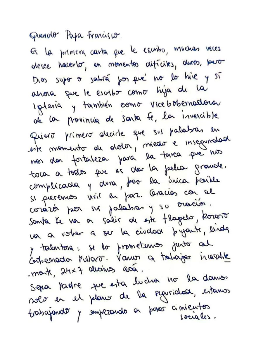 Scaglia contó en declaraciones periodísticas que tras el video en que el jefe de la Iglesia Católica pidió por la situación en Rosario, ella y el gobernador coincidieron en la necesidad de comunicarse con el sumo pontífice. Así, la vicegobernadora le escribió una carta el miércoles: “Le conté lo qué estábamos haciendo como gobierno. Le conté nuestra pelea en la provincia de Santa Fe, nuestros programas sociales, por qué creemos que de esto no se sale sólo con acciones de seguridad sino con inversión social. Además, cuánto trabajamos y cuántas horas al día le ponemos en esto. Y le aseguré que estábamos trabajando juntos: las iglesias, las empresas, la provincia, la municipalidad de Rosario en particular por lo que sucede en esa ciudad”, afirmó Scaglia.
