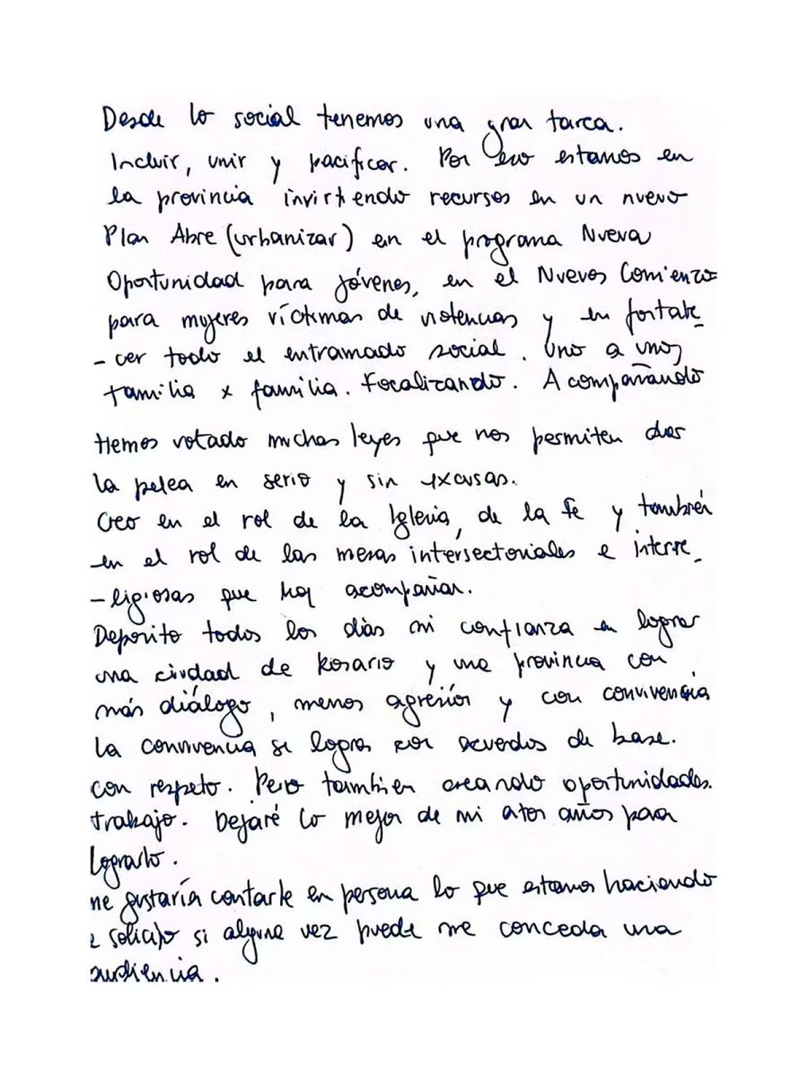 Morales Gorleri le recomendó a Scaglia que le escribiera una carta de puño y letra y ella se la hacía llegar al Vaticano. Así fue. En el texto, la vicegobernadora le agradeció al Papa las palabras del video y detalló las medidas en políticas sociales que implementaban para afrontar de manera integral la problemática que implica el narcotráfico en los barrios marginales de Rosario.