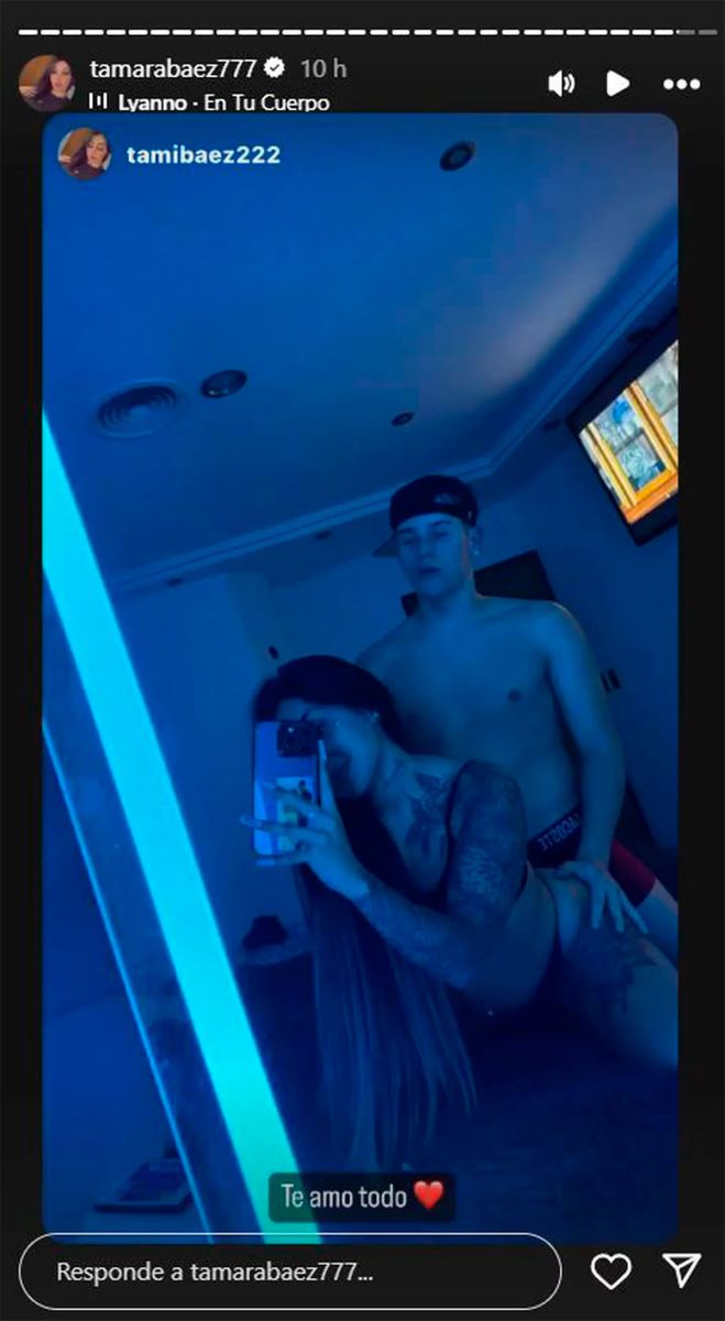 “Te amo todo”, escribió Tamara, junto a un emoji rojo, en la instantánea que es al borde lo prohibido. Los dos aparecen con copa interior, en una habitación que tiene una luz azul, mientras la influencer está sobre la cama con sus manos sobre el colchón mirando al espejo y su novio se asoma por detrás.