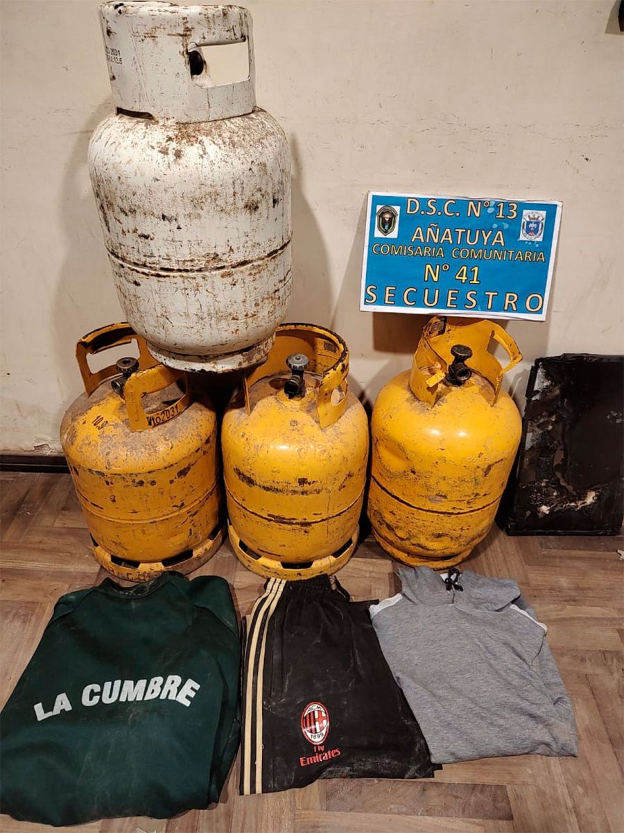 Entre los bienes recuperados que fueron secuestrados se encuentran indumentaria diversas, tres garrafas de 10 kg, y un monitor.