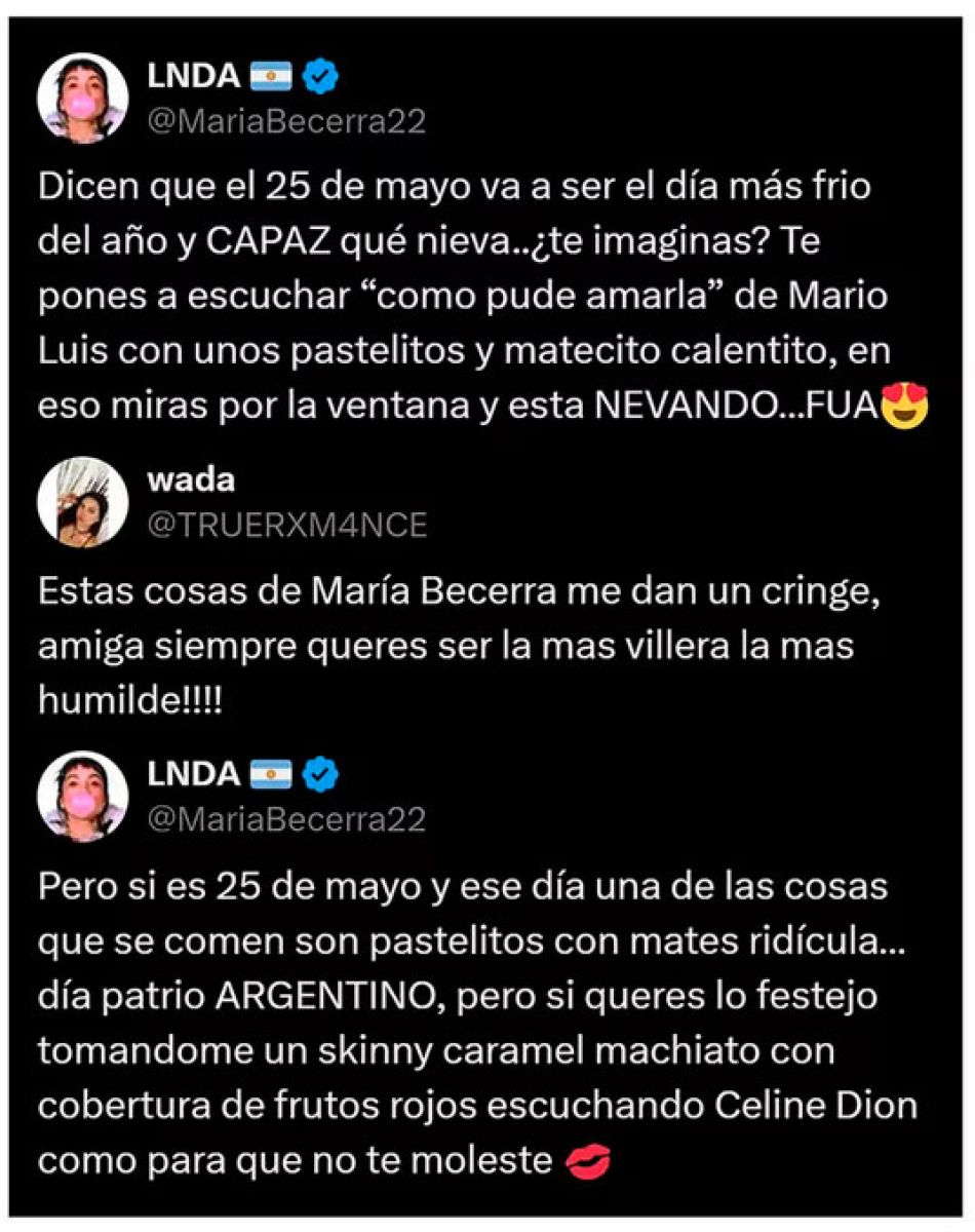Todo sucedió este jueves después de que María utilizara una de sus redes sociales para contarle a sus seguidores cómo festejaría el 25 de mayo. Si bien Becerra recibió miles de elogios hubo una crítica que no le gustó y no lo quiso dejar pasar. “Dicen que el 25 de mayo va a ser el día más frio del año y capaz que nieva... ¿Te imaginas? Te ponés a escuchar “Cómo pude amarla” de Mario Luis con unos pastelitos y matecito calentito, en eso miras por la ventana y está nevando… fua”, Escribió la cantante en su cuenta de X (ex Twitter).