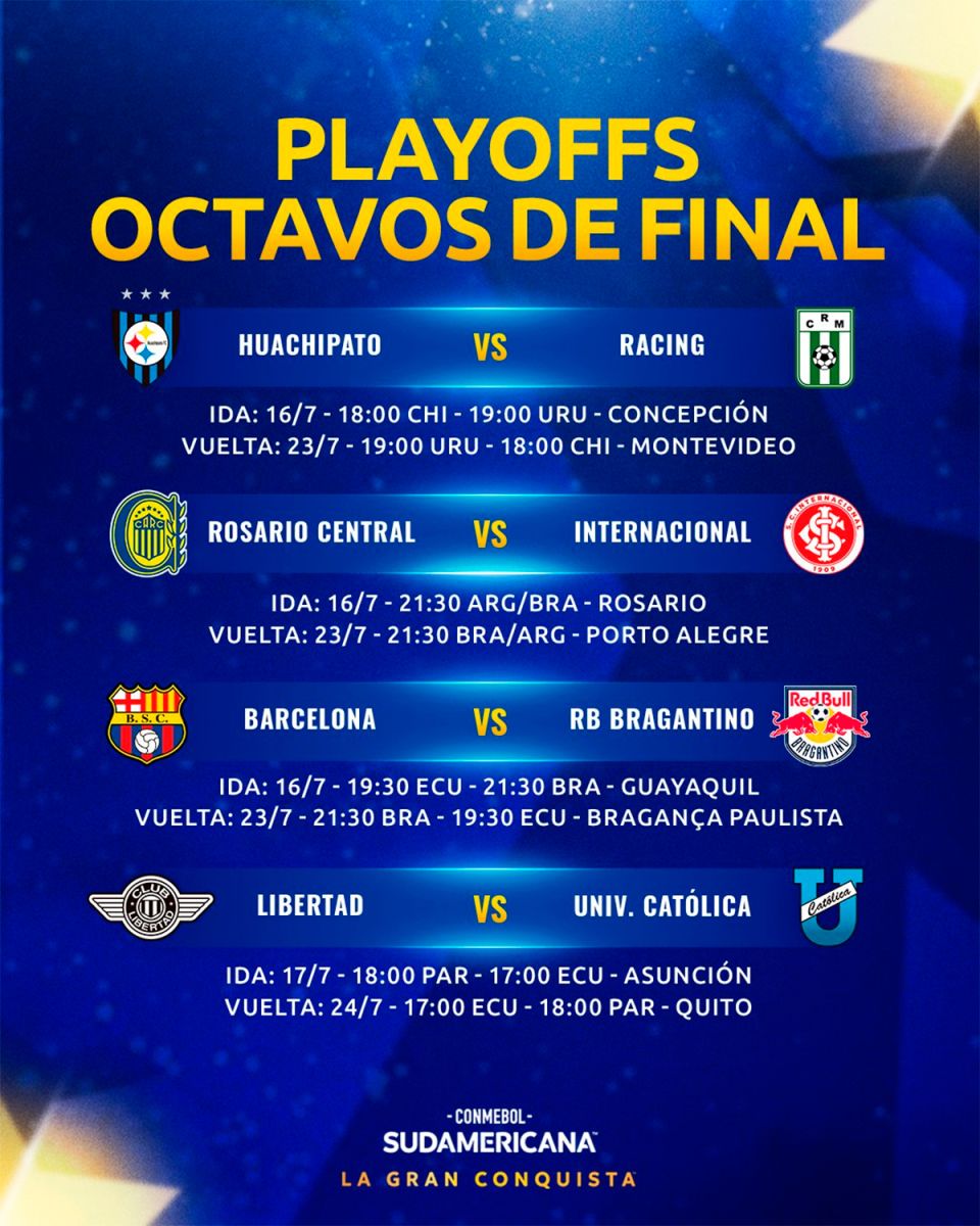 Por su parte, Rosario Central, tercero en su grupo de Libertadores, será local ante Inter de Porto Alegre, el conjunto de Chacho Coudet, en el primer partido, el martes 16 de julio a las 21.30. Promesa de partidazo, con un ídolo canalla en el banco visitante. Se estipula que la vuelta será en el Beira Río de Porto Alegre, afectado por las inundaciones en el sur de Brasil, el martes 23 de julio a la misma hora. El ganador de este mano a mano jugará en octavos con Fortaleza.