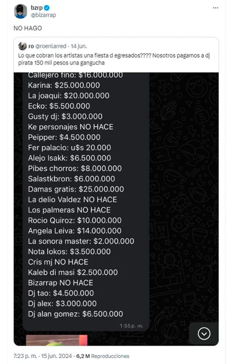 Hace unos días atrás se viralizó en X una lista publicada por una joven en la que se revela qué precios tienen los artistas del momento para presentarse en Fiestas de Egresados. "¿Lo que cobran los artistas una fiesta de egresados? Nosotros pagamos a DJ Pirata $150 mil, una gangucha", escribió la usuaria.