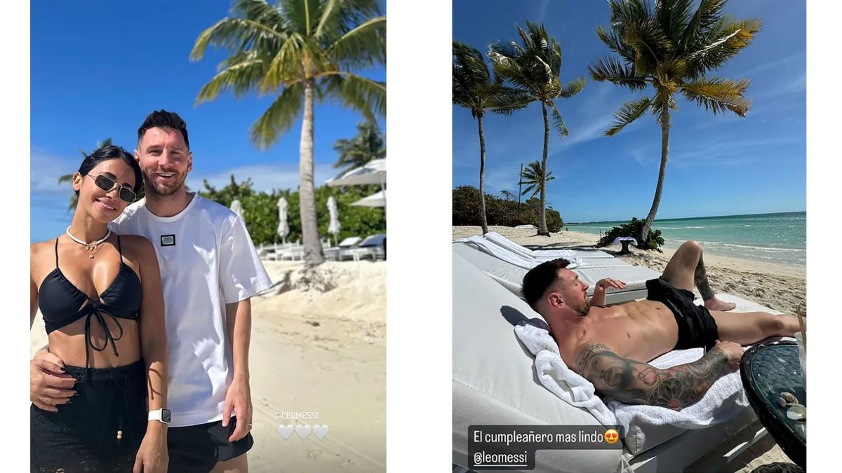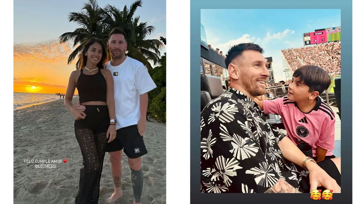 En el posteo de su esposa, el primer comentario es la respuesta de él. “Muchas gracias mi vida, los amo y los extraño!!!”, contestó el futbolista tres minutos después de que su esposa publicara la imagen, y mientras él está afectado a la Copa América 2024, concentrado en algún hotel de New Jersey con sus compañeros de selección. En las historias se esconden otras cuatro imágenes. La primera y la tercera son fotografías de Antonela y Leo en una playa en el mismo día, en la segunda aparece él vestido con una camisa hawaiana junto a su hijo Mateo en las tribunas del estadio Chase, donde hace de local el Inter Miami, y en la cuarta figura solo él recostado en una reposera con la leyenda “el cumpleañero más lindo”.