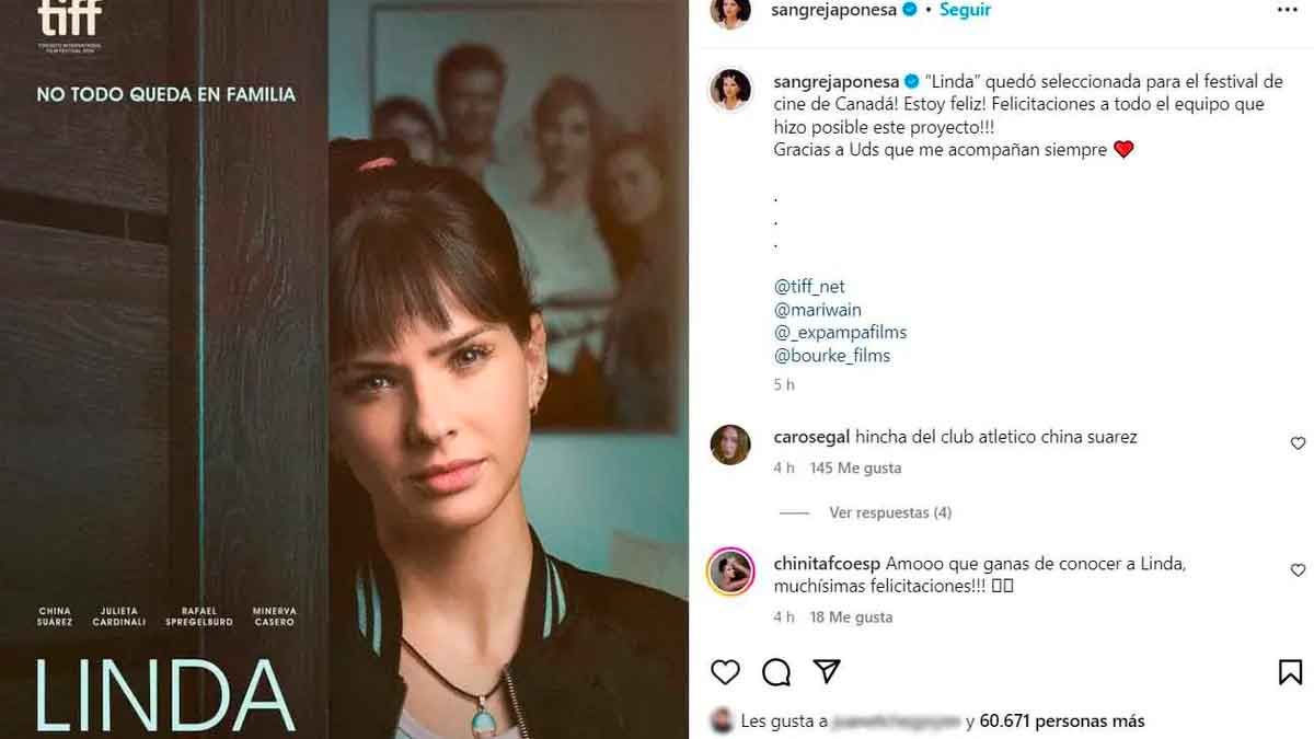 "Linda quedó seleccionada para el festival de Canadá. ¡Estoy feliz!", escribió la China en el epígrafe de la publicación que tiene varias imágenes, entre ellas, la del póster del largometraje.