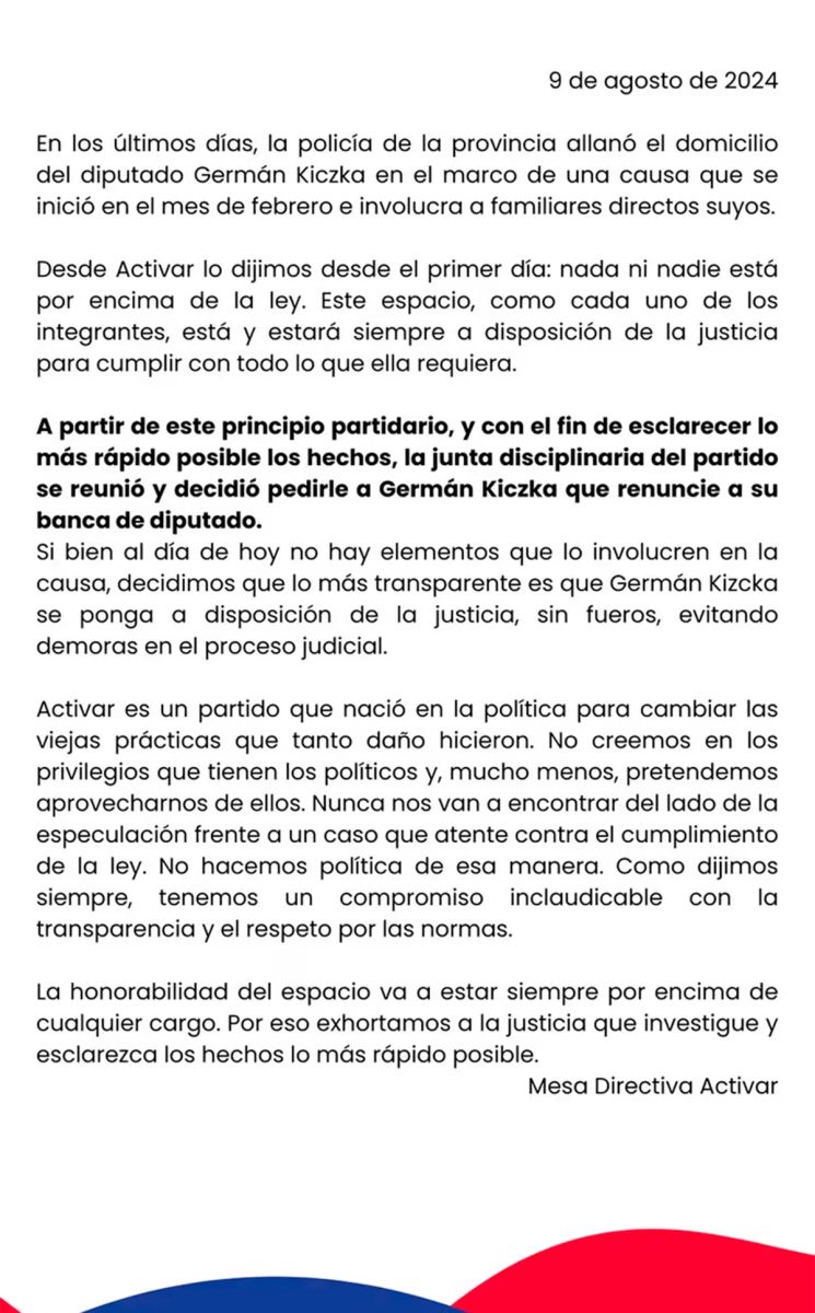 “En los últimos días, la policía de la provincia allanó el domicilio del diputado Germán Kiczka en el marco de una causa que se inició en el mes de febrero e involucra a familiares directos suyos. Desde Activar lo dijimos desde el primer día: nada ni nadie está por encima de la ley. Este espacio, como cada uno de los integrantes, está y estará siempre a disposición de la Justicia para cumplir con todo lo que ella requiera”, expresaron en un comunicado emitido por la mesa directiva del partido Activar.