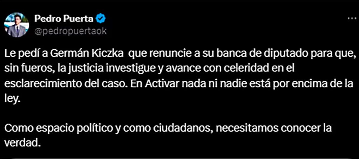 El comunicado fue difundido por el propio Puerta, presidente del partido Activar, quien agregó: “Le pedí a Germán Kiczka que renuncie a su banca de diputado para que, sin fueros, la justicia investigue y avance con celeridad en el esclarecimiento del caso”.