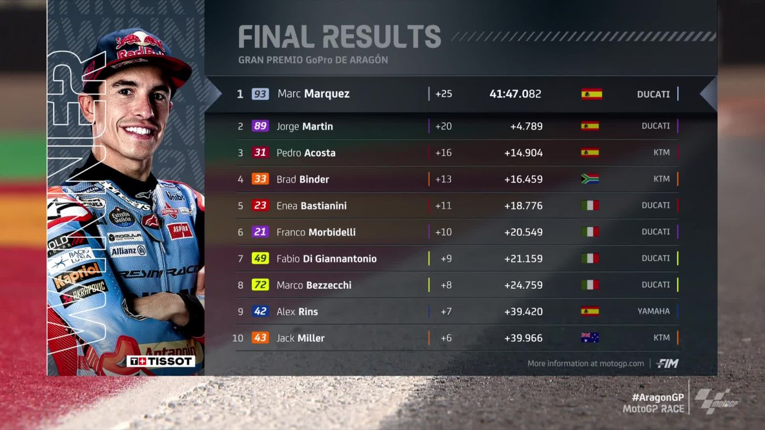 Con esta victoria, Márquez desplazó al italiano Enea Bastianini (Ducati) del tercer puesto del campeonato, ubicándose en su lugar. A pesar de su destacada actuación, el ocho veces campeón del mundo aún se encuentra a 70 puntos del líder de la tabla, Jorge Martin, lo que complica sus posibilidades de lograr el título.