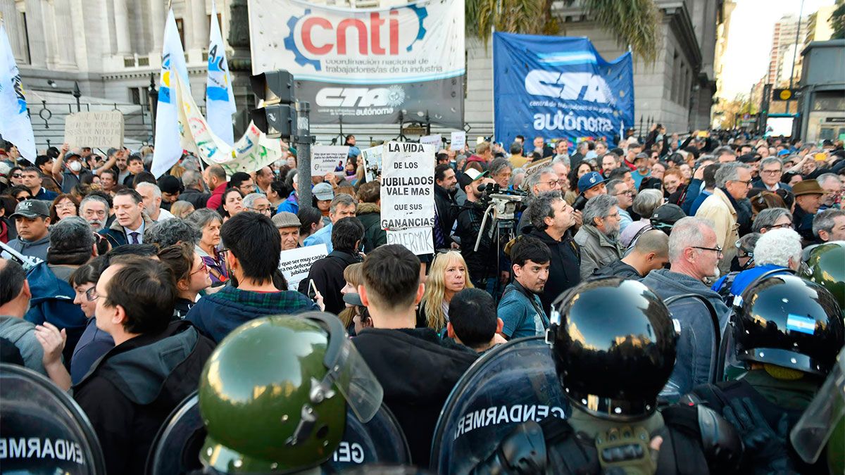 Hubo un fuerte operativo de seguridad de Policía Federal, Prefectura y Gendarmería por el protocolo antipiquetes. La tensión comenzó desde el inicio de la protesta y estalló cuando los manifestantes daban una vuelta a la manzana.