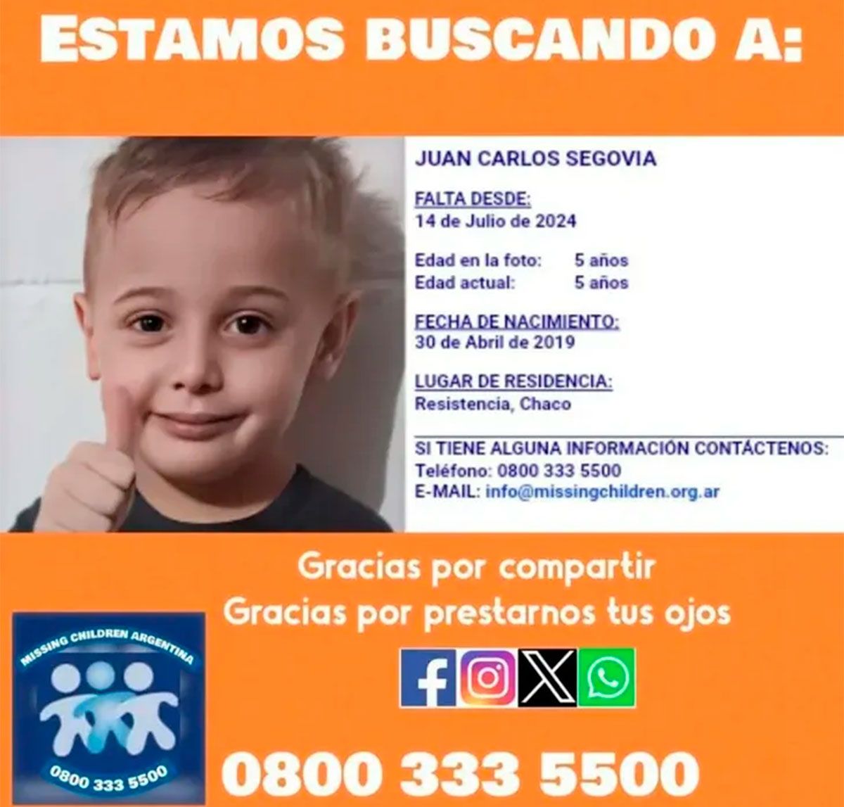 niño de 5 años desapareció hace más de dos meses en Chaco y los investigadores del caso sospechan que la mamá del menor lo raptó y escapó hacia la provincia de Corrientes. La búsqueda se intensificó en las últimas horas y los especialistas también destacan la posibilidad de que el menor esté oculto en Buenos Aires. El caso es comparado con el de Loan Danilo Peña, el niño desaparecido el 13 de junio en Corrientes. Quién es el menor desaparecido en Chaco El 14 de julio de este año se dio a conocer que Juan Carlos Segovia, de 5 años, desapareció de su casa en Resistencia y, tras la denuncia de su papá, la principal hipótesis es que su mamá, Soledad Patricia Ubeda, lo raptó y se lo llevó a otra provincia. Aunque todavía sigue siendo incierto su paradero, en las últimas horas se incrementó la posibilidad de que el menor y su madre estén refugiándose en Corrientes o en Buenos Aires, lo que complicaría aún más la investigación. Desde medios locales indicaron que la hipótesis de su paradero en la localidad correntina de Virasoro surgió tras la declaración del padre del niño, motivo por el cual se incrementaron los operativos en la zona. La otra línea de investigación que sigue de cerca la Justicia es que el niño estaría en Buenos Aires ya que no hay pistas firmes sobre su situación actual. Si esta hipótesis se confirma, los investigadores manifiestan que la amplitud geográfica complica el caso ya que podrían estar ocultos en cualquier ciudad. La causa es investigada por el Equipo Fiscal N° 6 y en los primeros días de búsqueda la organización Missing Children Argentina generó un alerta nacional para que quien tenga datos sobre el paradero del menor pueda aportarlos.