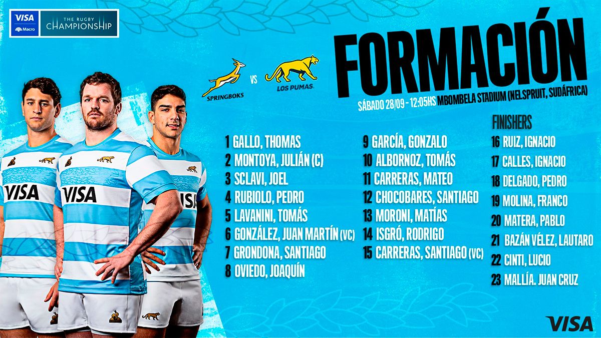Los Pumas anunciaron su formación para lo que será el duelo ante Sudáfrica, por la definición en busca del título del Rugby Championship que se disputará el sábado desde las 12.05.