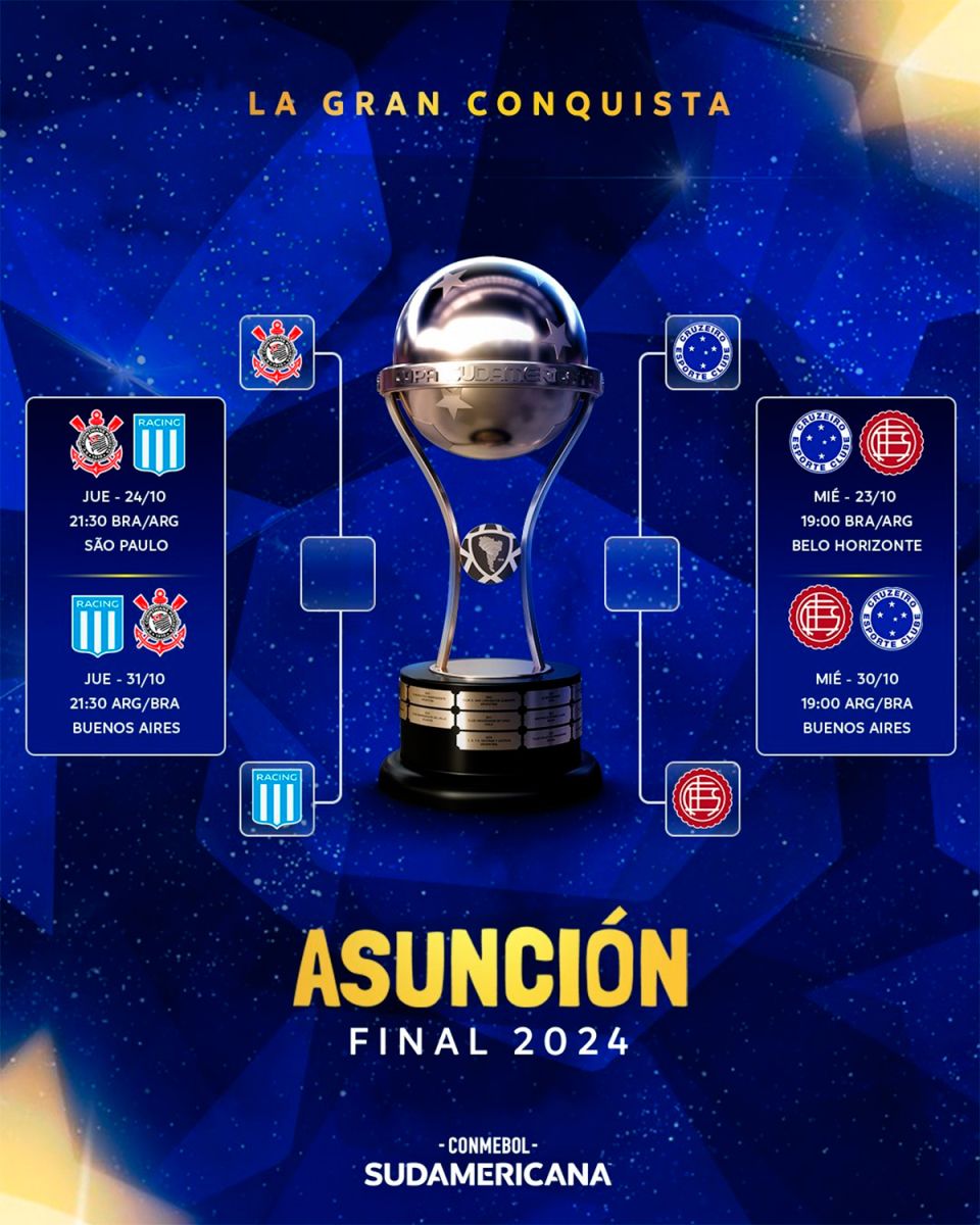 Racing, dirigido por Gustavo Costas, iniciará la serie en Brasil. El primer partido se disputará el jueves 24 de octubre a las 21:30 en San Pablo, mientras que la revancha tendrá lugar una semana después en Avellaneda, también a las 21:30. El conjunto argentino buscará un resultado favorable en tierras brasileñas para definir la clasificación a la final ante su gente.