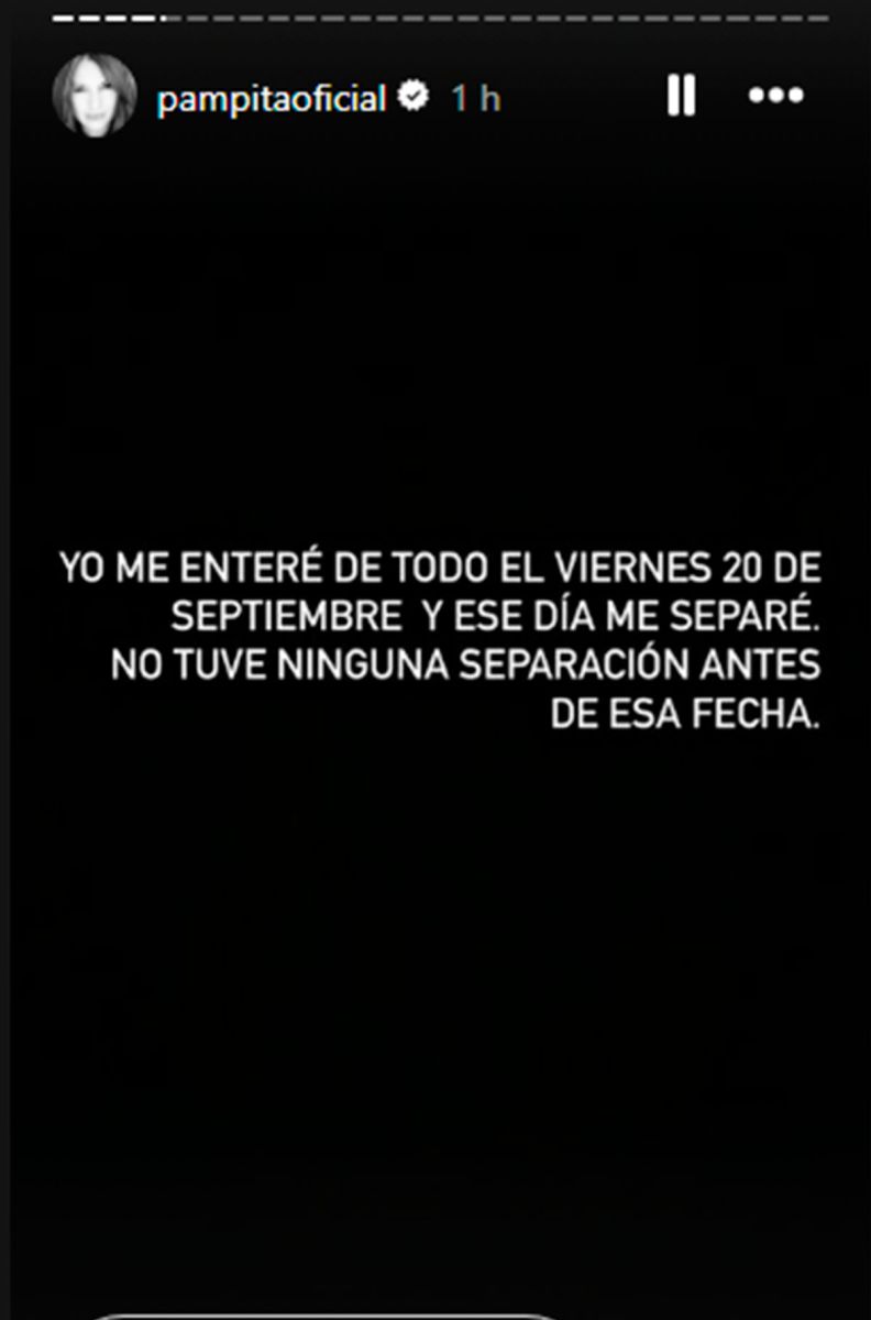 Aproximadamente una horas después, la modelo se expresó breve y contundentemente en sus historias de Instagram: “Yo me enteré de todo el viernes 20 de septiembre y ese día me separé. No tuve ninguna separación antes de esa fecha”, sentenció con letras blancas y fondo negro.
