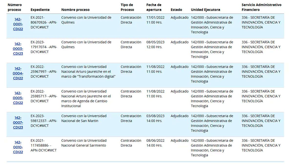 Fueron numerosos los ministerios que contrataron a universidades. En la lista están el Ministerio de Ciencia; la Secretaria General de la Nación; INDEC; Instituto Nacional de Asociativismo y Economía Social; INADI; Ministerio de Turismo; Desarrollo Productivo; Seguridad, Agencia de Acceso a la Información Pública; jefatura de gabinete; Min de Desarrollo Territorial y Hábitat; Administración de Parques Nacionales; Ministerio de Mujeres; Ministerio de Desarrollo Social, Biblioteca Nacional; Ministerio de Cultura; entre otros.