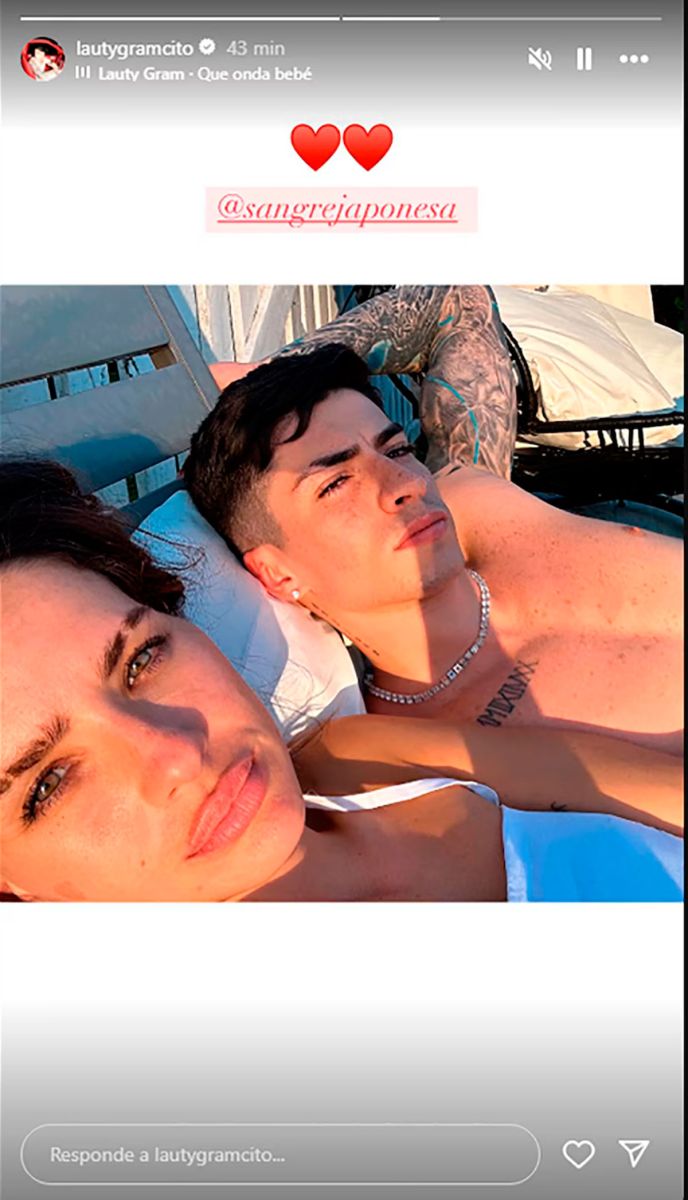 Para darle fuerza a este mensaje, en el que por primera vez se los ve juntos y en este mood de romance, Lauty Gram arrobó a la también cantante y le agregó dos emojis de corazones rojos.