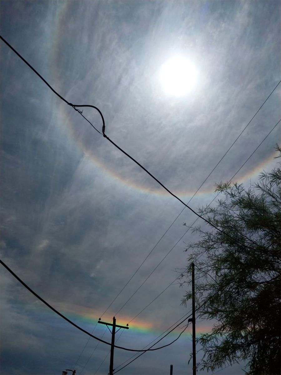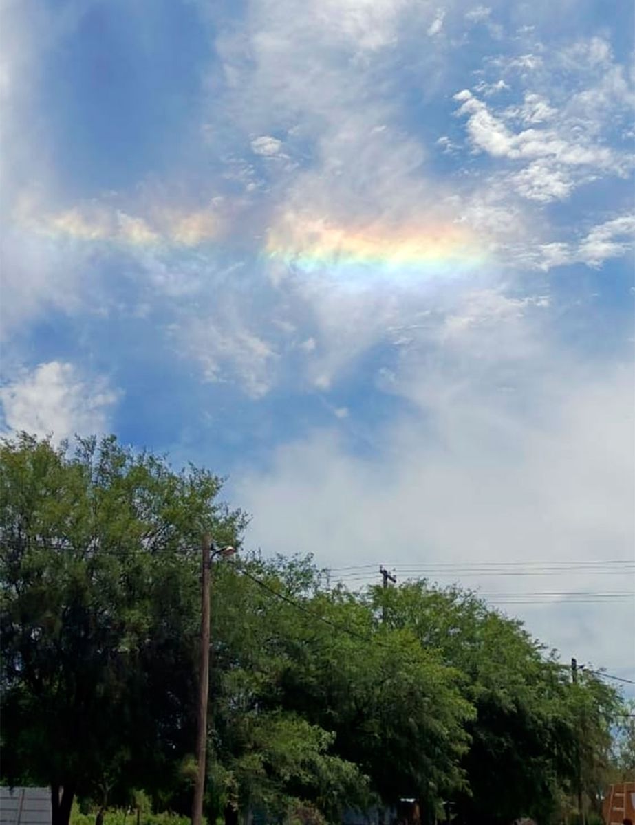Alrededor del mediodía de este jueves, un halo solar y una nube iridiscente colorearon el cielo santiagueño acaparando la atención de muchos transeúntes.