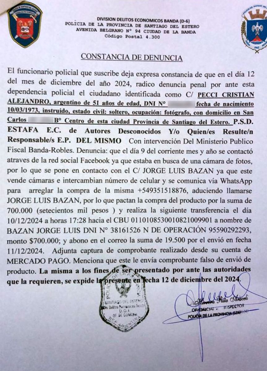 Fue así que Cristian Pecci, con domicilio en la ciudad de La Banda, vio que una persona que se identificó como Jorge Luis Bazán ofrecía a través de Marketplace, de Facebook, una cámara de las características que buscaba y a un precio conveniente.