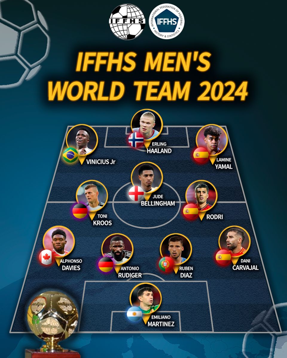 El equipo ideal de la IFFHS estuvo dominado por figuras del Real Madrid, con cinco representantes: Dani Carvajal, Antonio Rüdiger, Toni Kroos, Jude Bellingham y Vinícius Jr., quien además recibió el premio The Best al mejor jugador de la temporada. Manchester City aportó tres jugadores: Rúben Dias, Rodri (Balón de Oro 2024) y Erling Haaland, mientras que Alphonso Davies (Bayern Múnich) y Lamine Yamal (Barcelona) completaron la alineación.