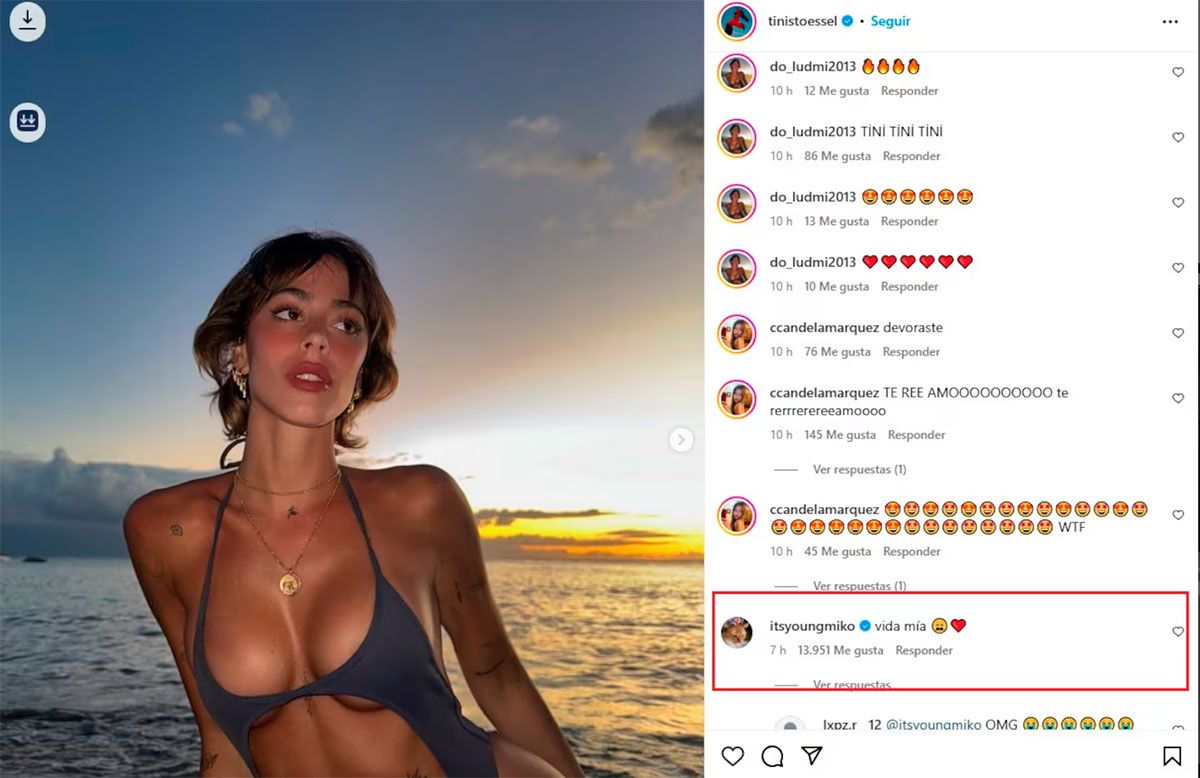 Fue Tini la que hace tres semanas le escribió a Young Miko un comentario como respuesta a un mensaje que había recibido. “Vos mi vida”, redactó junto a un emoji de una carita lagrimeando y un corazón rojo.