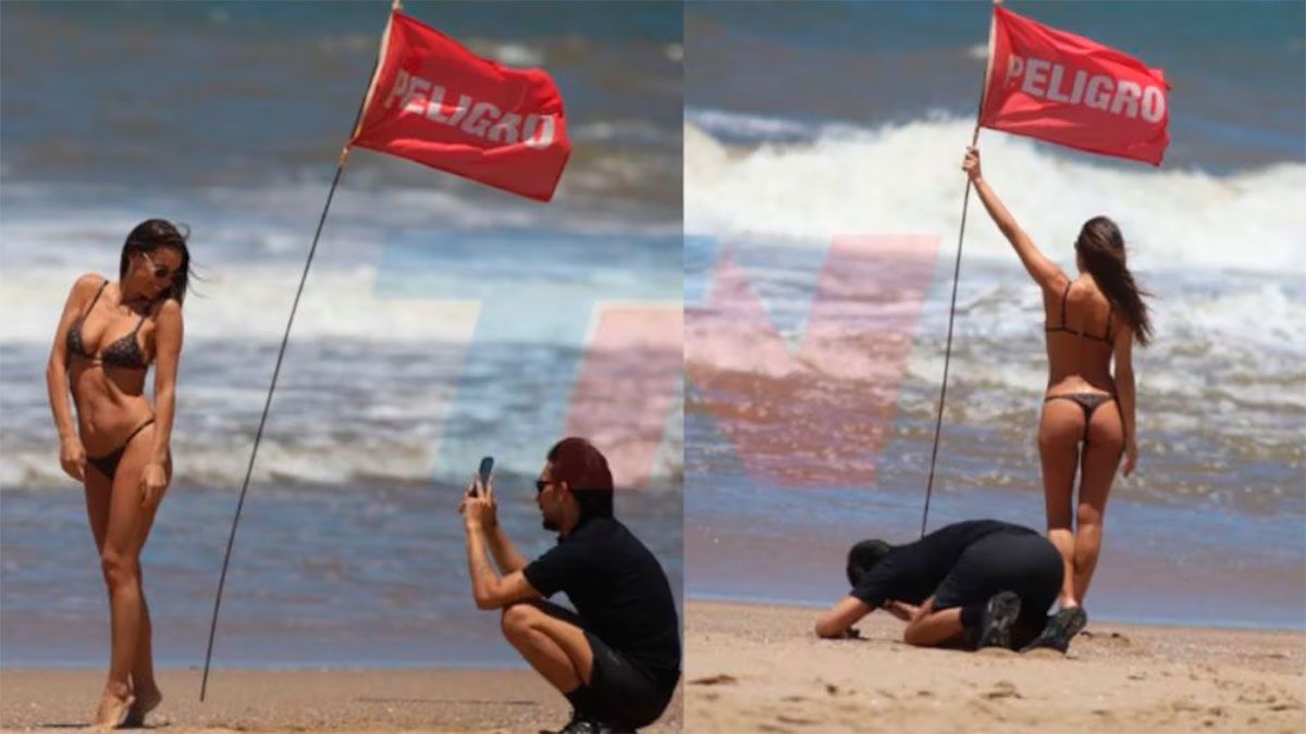 Durante la jornada en la playa, la modelo aprovechó para hacer una producción de fotos en la que posó en bikini junto a una bandera roja que decía “Peligro”.