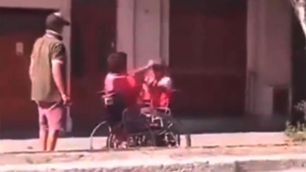 La grabación muestra a dos hombres en sillas de ruedas: uno con camiseta roja y otro con gorra negra, luchando en un enfrentamiento físico.
