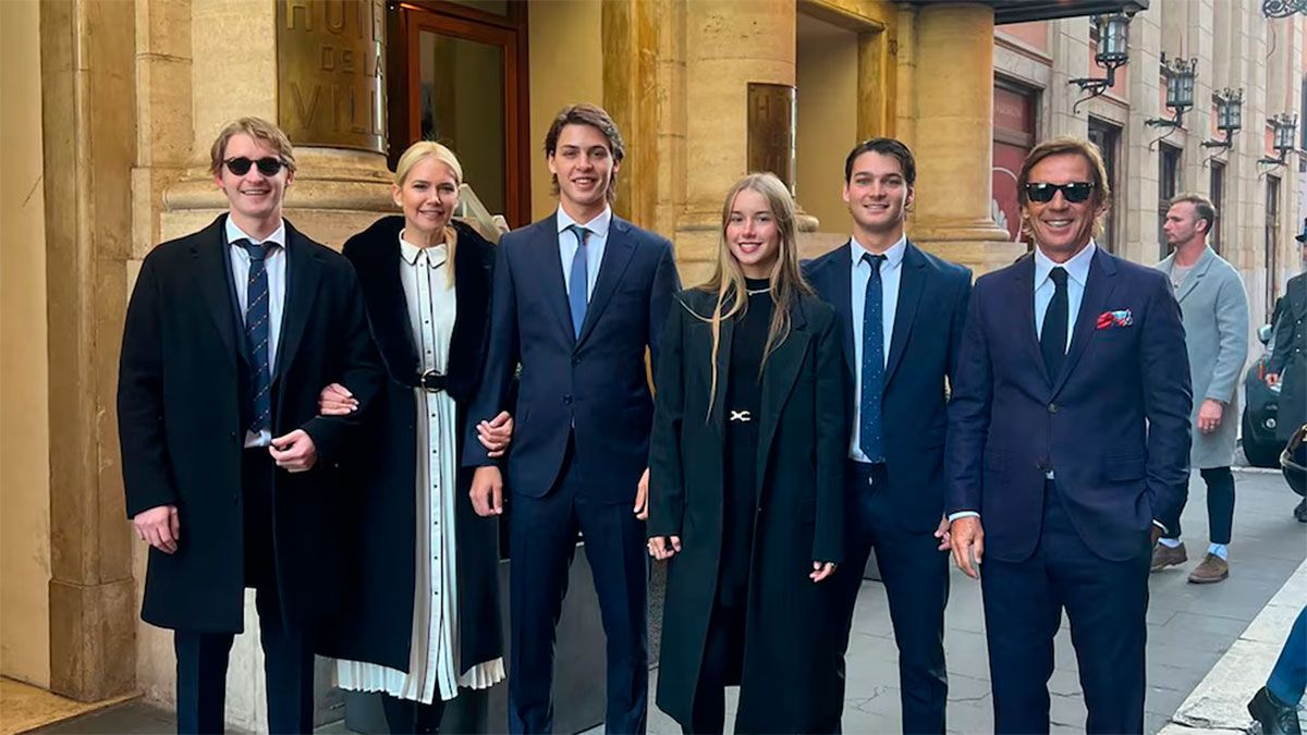 Los hijos varones no se quedaron atrás. Balthazar, Tiziano y Benicio, de mayor a menor, también optaron por ambos en color azul noche, camisas blancas, zapatos negros y corbatas azules con estampados sutiles.