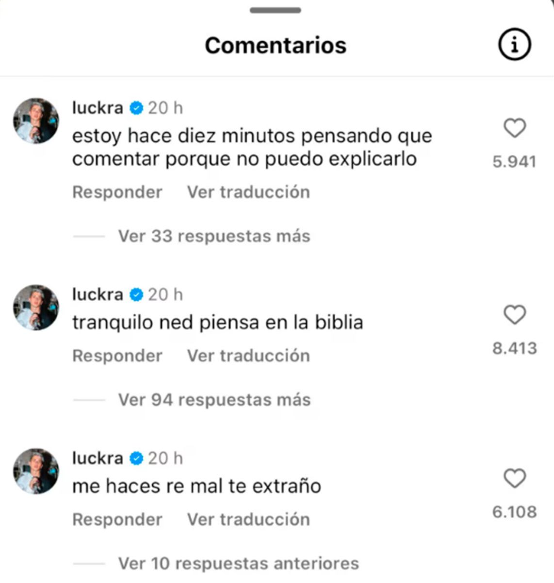 Entre ellos, uno no pasó desapercibido y fue el de Luck Ra, que le escribió: “Estoy hace diez minutos pensando qué comentar porque no puedo explicarlo. Me hacés re mal, te extraño”, a lo que ella le respondió: “Mi amor, te...”, acompañado del emoji de un corazón.