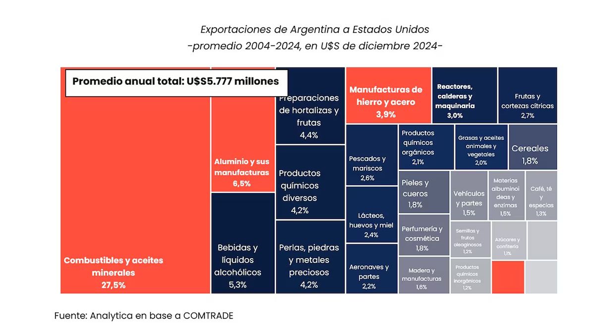 Entre 2004 y 2024, la Argentina exportó en promedio USD 3.289 millones anuales en aluminio, hierro, acero y sus manufacturas, de los cuales el 21% (un promedio de USD 657 millones anuales) tuvieron como destino Estados Unidos. Aproximadamente el 43% de las compras de aluminio argentino fueron realizadas por el mercado estadounidense.