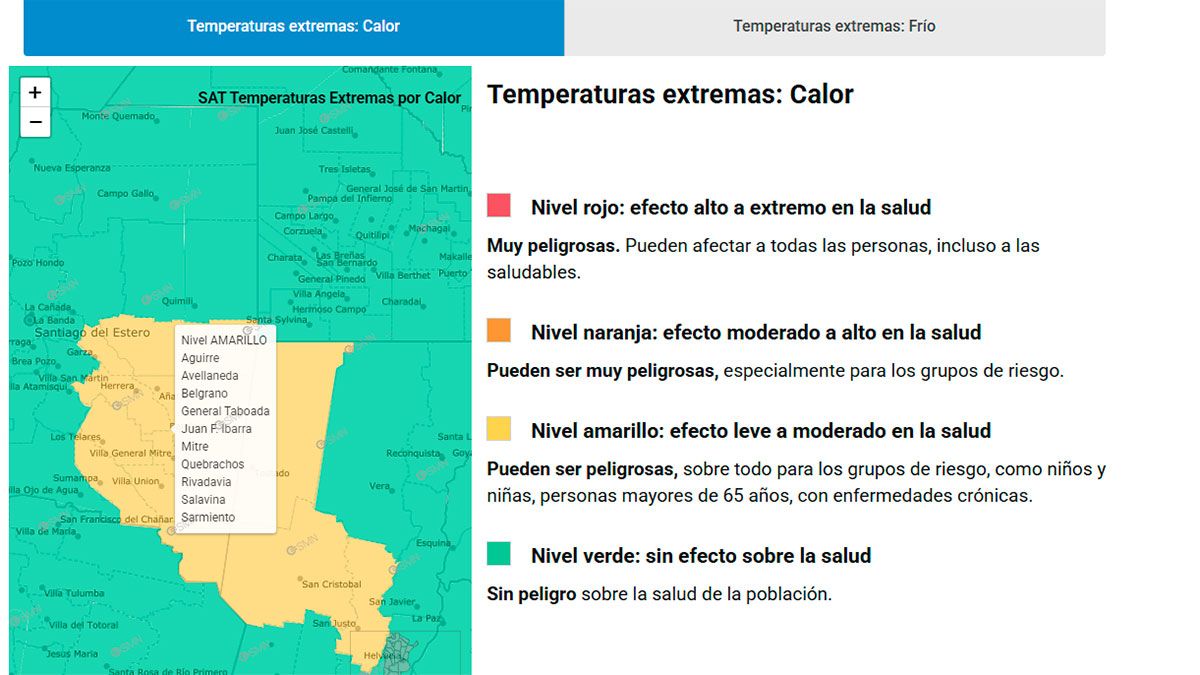 Además los departamentos: Aguirre, Avellaneda, Belgrano, Gral. Taboada, Juan F. Ibarra, Mitre, Quebrachos, Rivadavia, Salavina y Sarmiento, se encuentran bajo Alerta Amarillo por altas temperaturas, advertencia emitida a través del Sistema de Alerta Temprana (SAT) del SMN.