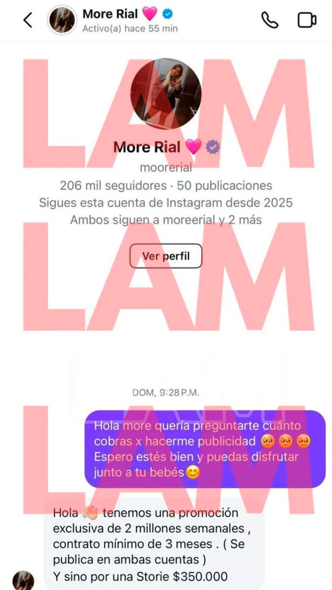"Hola. Tenemos una promoción exclusiva de 2 millones semanales, contrato mínimo de 3 meses (se publica en ambas cuentas). Sino por una storie $350.000", fue la respuesta que dio la influencer.