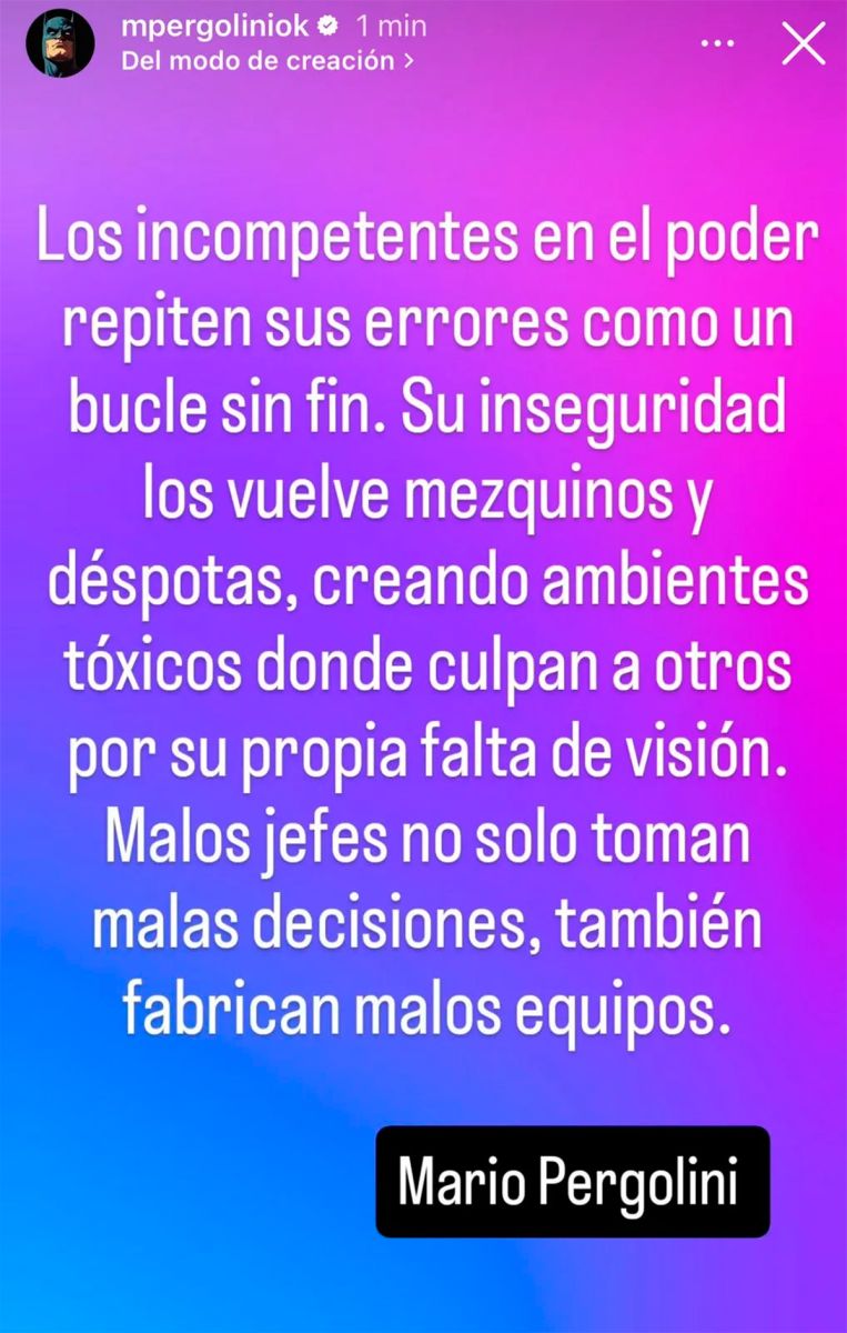"Los incompetentes en el poder repiten sus errores como un bucle sin fin. Su inseguridad los vuelve mezquinos y déspotas, creando ambientes tóxicos donde culpan a otros por su propia falta de visión", escribió Pergolini en su publicación.