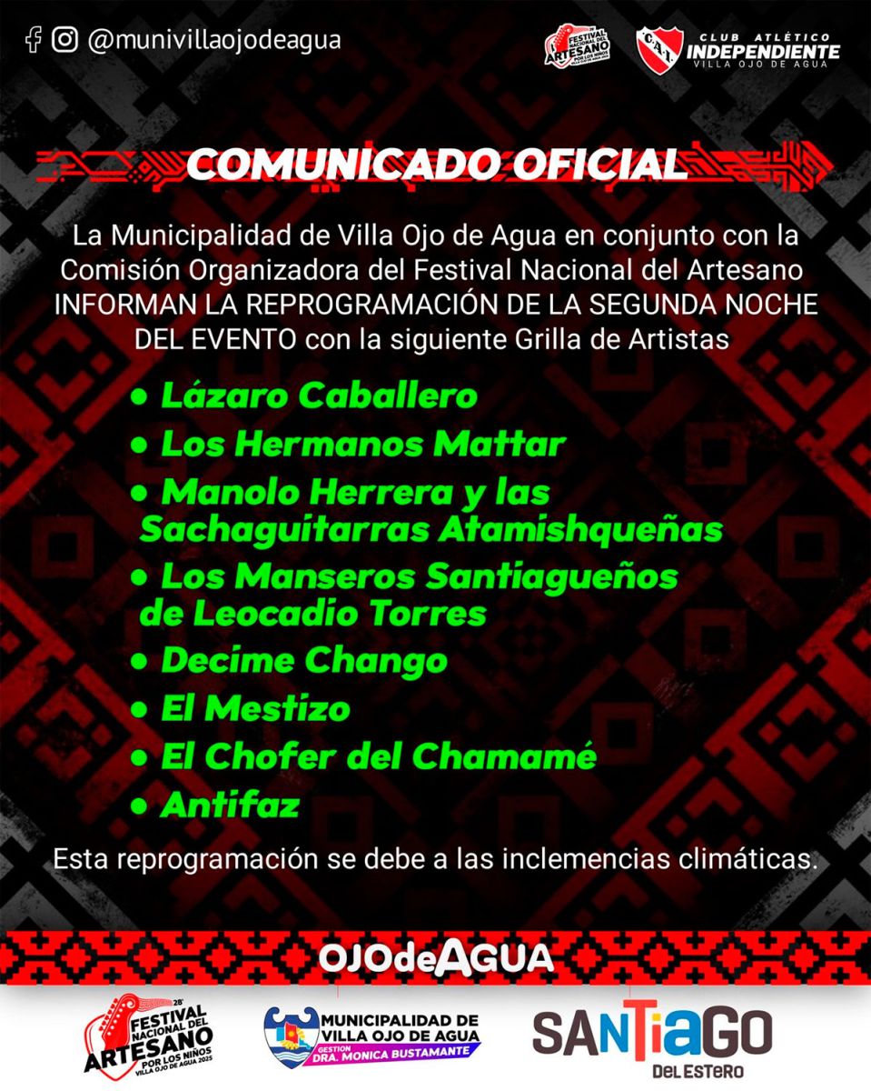 La Municipalidad de Ojo de Agua tomó la determinación de reprogramar la segunda noche con la siguiente grilla de artistas a una fecha a determinar: