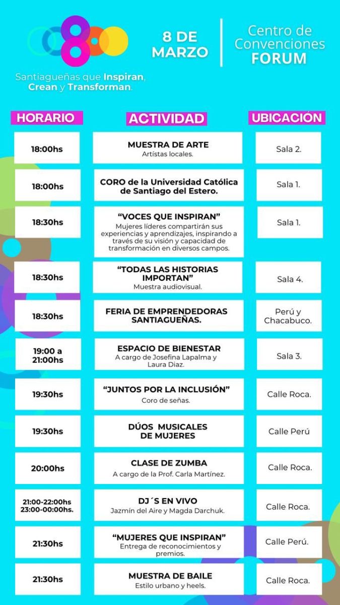 Otro de los espacios destacados será la Feria de Emprendedoras Santiagueñas, con la participación de marcas de emprendedoras locales; food trucks; djs y artistas en vivo; intervenciones teatrales y escuelas de danzas urbanas.