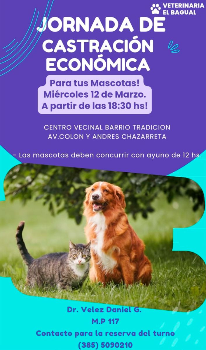 El miércoles 12 de junio, desde las 18:30, se realizará una nueva jornada de castraciones económicas en el barrio Tradición, destinada a perros y gatos.