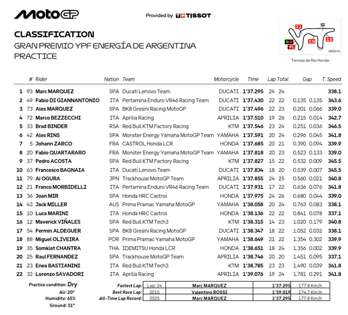 Detrás de Márquez, el segundo mejor tiempo fue para Fabio Di Giannantonio (Ducati), quien llegó a liderar por algunos minutos pero terminó a 0s135 del español. En tanto, Álex Márquez (Ducati) completó el podio de la jornada, ubicándose a 0s201.