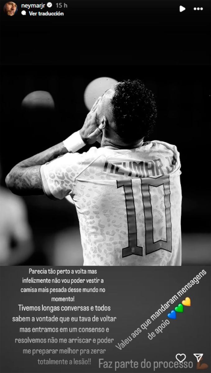 "Parecía estar cerca la vuelta, pero lamentablemente no voy a poder vestir la camiseta más pesada de este mundo. Tuvimos largas conversaciones y todos saben las ganas que tenía de volver, pero entramos en un consenso y resolvimos no arriesgar y poder prepararme mejor para recuperarme totalmente de la lesión", escribió el astro brasileño en su cuenta de Instagram, acompañado de una imagen en blanco y negro con la camiseta de la Verdeamarela.