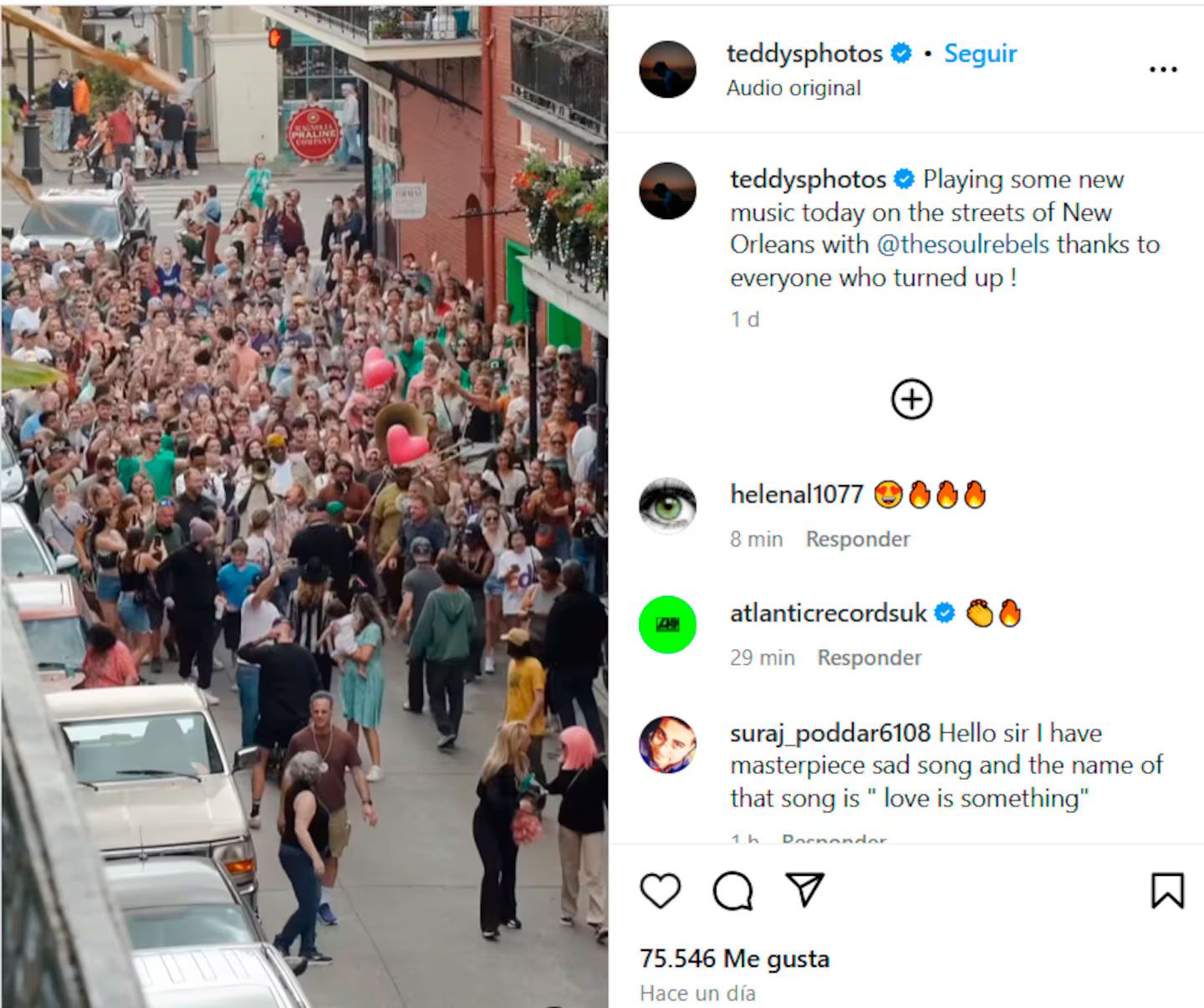 “Tocando música nueva hoy en las calles de Nueva Orleans con @thesoulrebels ¡gracias a todos los que aparecieron!”, publicó en su perfil de Instagram con un video donde se lo ve por las calles de la ciudad, micrófono en mano y seguido por cientos de personas que escuchaban sus canciones.