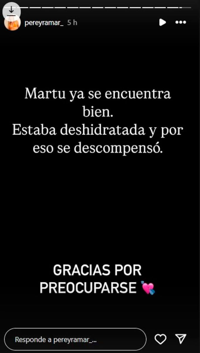 Atenta a la situación que vive dentro del juego, la familia hizo una publicación en su Instagram para llevar calma luego de la viralización del clip. “Martu ya se encuentra bien. Estaba deshidratada y por eso se descompensó. Gracias por preocuparse”, escribieron en una historia.