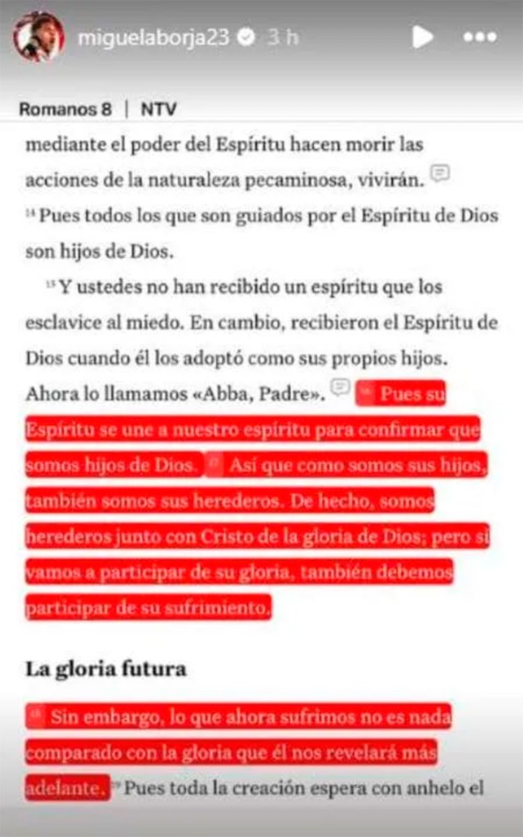 El Colibrí publicó un fragmento del octavo capítulo del libro Cartas a los Romanos, donde hizo énfasis en una parte particular: "Si vamos a participar de la gloria, también debemos participar de su sufrimiento". Su mensaje hizo recordar a muchos hinchas la remera que mostró tras marcarle a Boca de penal en el Superclásico 2023, que decía: "La gloria es para Dios".