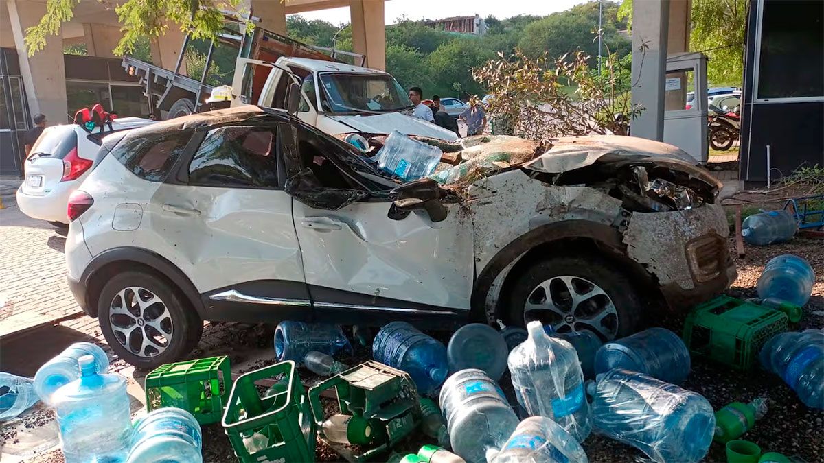 Un accidente inusual generó alarma ayer jueves por la mañana en el interior de un country privado de La Calera, en la provincia de Córdoba, cuando un camión con carga de agua y soda cayó desde un puente y terminó aplastando dos autos y una motocicleta que se encontraban estacionados en la parte inferior del predio.