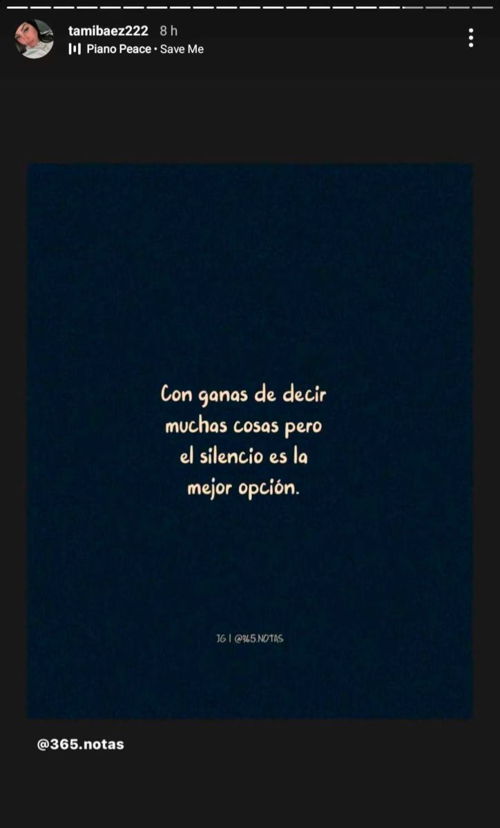 Al mismo tiempo, Tamara Báez publicó en su perfil de Instagram una frase tajante que se interpretó como una indirecta para su ex. Además, mostró sin filtros lo que hizo junto a su novio.