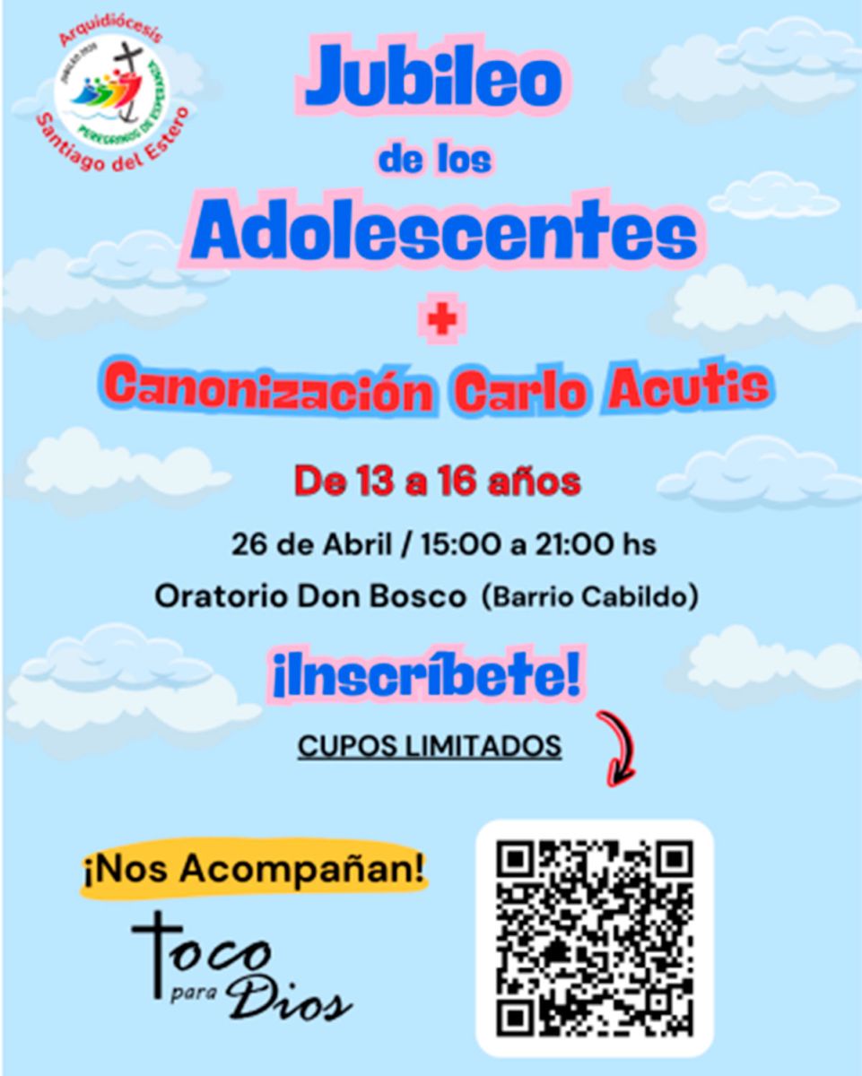 La Arquidiócesis de Santiago del Estero invita a todos los adolescentes de 13 a 16 años a participar del Jubileo de los Adolescentes, un encuentro de fe y comunidad que se realizará en el Oratorio Don Bosco el próximo 26 de abril, de 15:00 a 21:00 hs. La jornada se enmarca en la celebración de la Canonización del Beato Carlo Acutis, y propone un espacio de alegría, reflexión y música para los jóvenes.